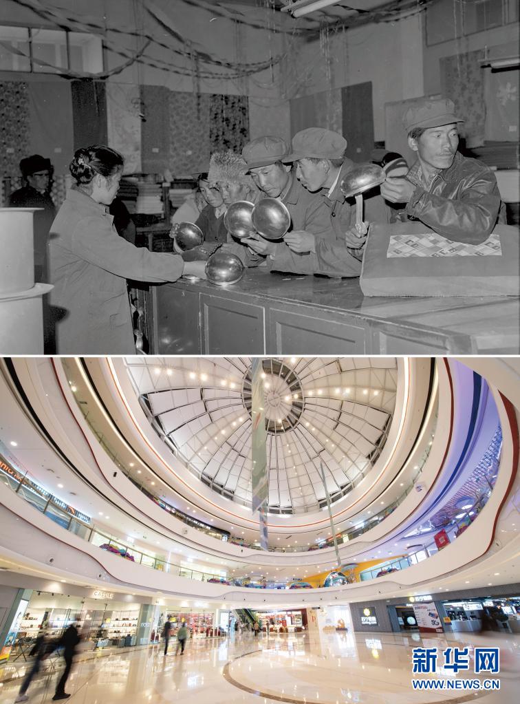 拼版照片:上圖是20世紀80年代,人們在拉薩一家商店購物(新華社發(fā) 劉麗嘉攝);下圖是2021年8月15日,人們在拉薩市萬達廣場購物(新華社記者孫非攝)。新華社發(fā)