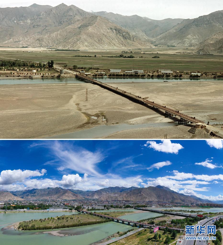 拼版照片:上圖是20世紀50年代的拉薩大橋(新華社記者王純德攝);下圖是2021年8月9日拍攝的拉薩大橋新貌(新華社記者孫非攝,無人機照片)。新華社發(fā)