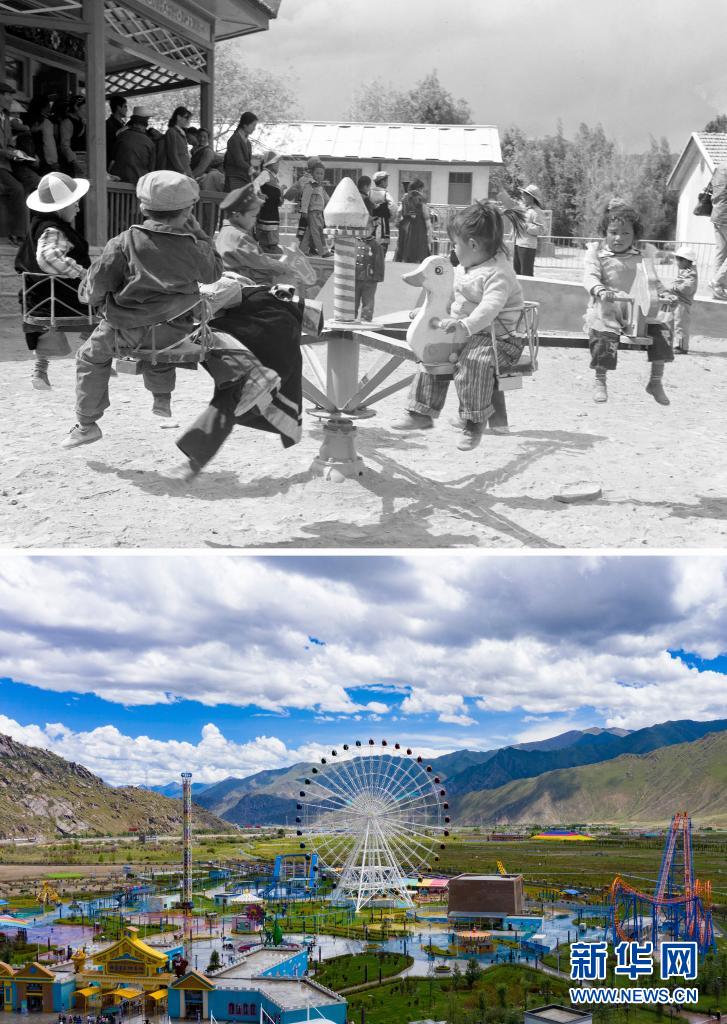 拼版照片:上圖是20世紀80年代,日喀則幼兒園的孩子們在玩動物圓盤轉椅(新華社記者程曦攝);下圖是2021年8月9日拍攝的拉薩市象雄美朵游樂園(新華社記者張汝鋒攝,無人機照片)。新華社發(fā)