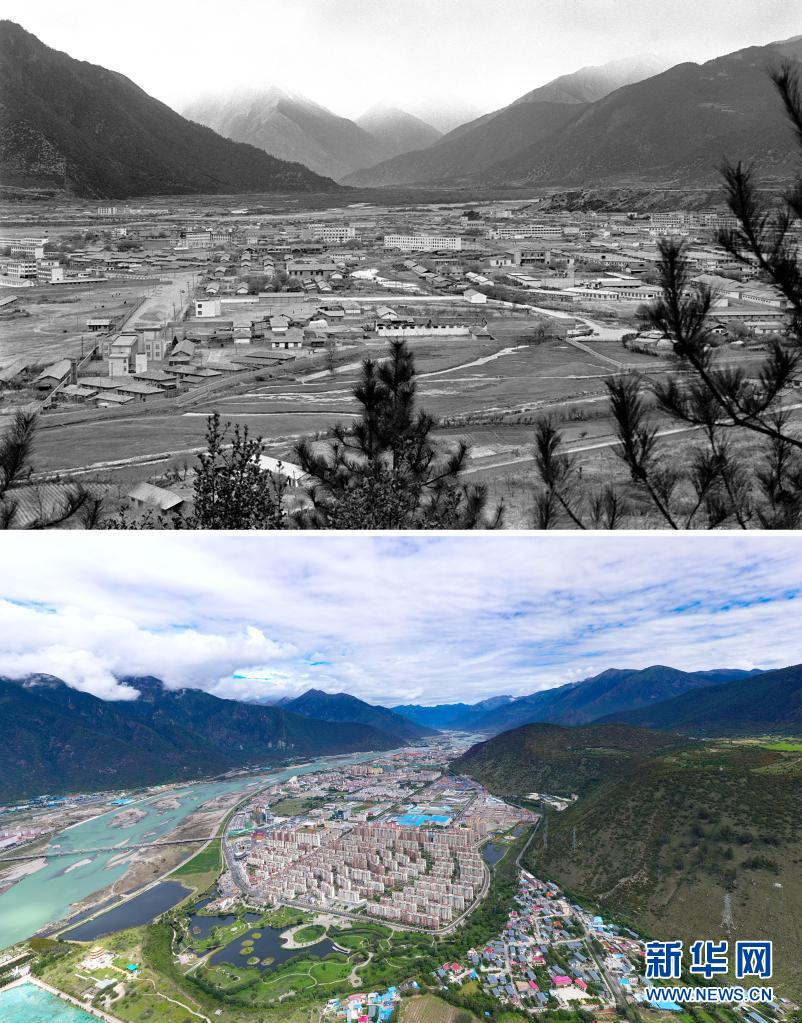 拼版照片:上圖是20世紀90年代的林芝八一鎮(zhèn)(新華社記者陳燮攝);下圖是2021年7月20日拍攝的林芝八一鎮(zhèn)風貌(新華社記者普布扎西攝,無人機照片)。新華社發(fā)