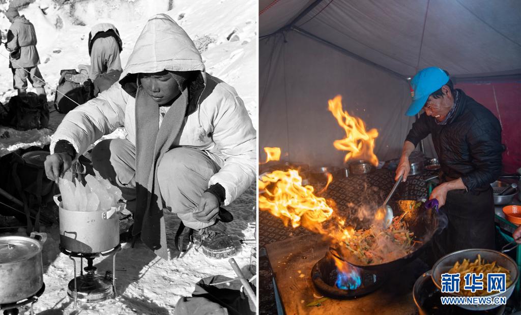 拼版照片:左圖是20世紀60年代,我國登山隊員在海拔5700米冰川上宿營時融冰煮飯(新華社記者陳宗烈攝);右圖是2020年5月10日,廚師在海拔6500米的前進營地炒菜(新華社記者孫非攝)。新華社發(fā)