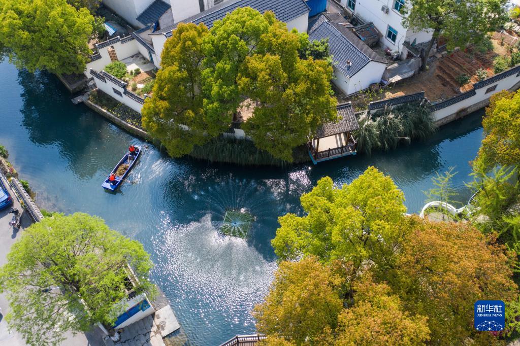 在浙江省長興縣龍山街道渚山村,保潔人員進(jìn)行日常河道護(hù)理巡查(2020年4月9日攝,無人機(jī)照片)。新華社記者 徐昱 攝