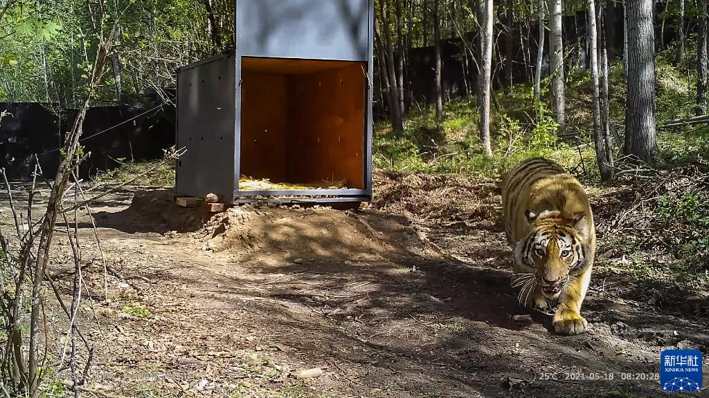 2021年5月18日,在黑龍江省穆棱林業(yè)局有限公司林場,之前在密山市獲得成功救護的野生東北虎從鐵箱子里走出,回歸自然(視頻截圖)。新華社發(fā)