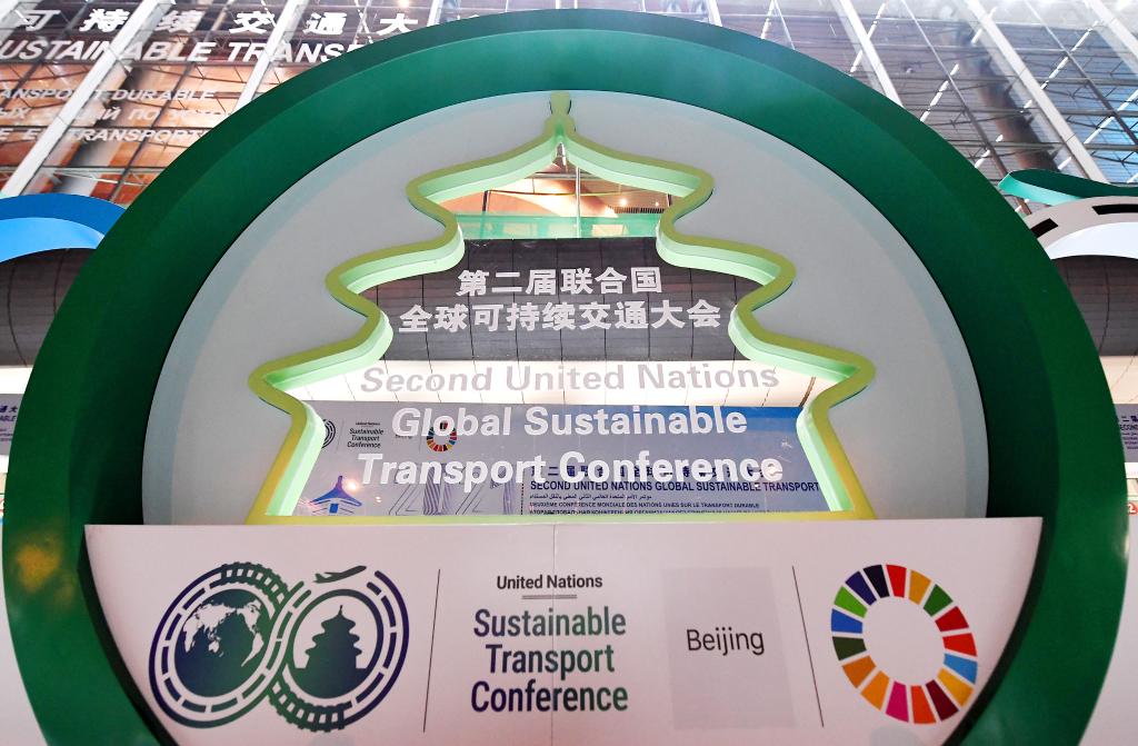 在北京國家會(huì)議中心拍攝的第二屆聯(lián)合國全球可持續(xù)交通大會(huì)標(biāo)志(10月14日攝)。新華社記者 李賀 攝