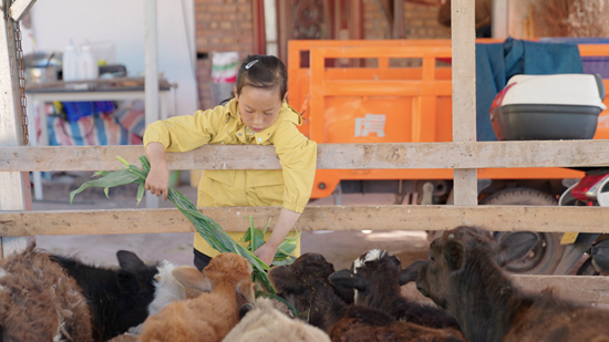 “妞妞合唱團”的成員“粉妞妞”在家中給牛喂草。