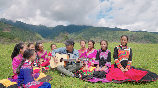 路面因為剛剛下過的雨水變得有些泥濘,走了約半小時的山路后,鄉(xiāng)村教師吉布小龍帶著合唱團的“妞妞們”坐在山頂草坪上。他用吉他伴奏,9個女孩圍著他放聲歌唱:“不懼密林深處的豺狼,敢于深海淺灘與蛇蝎作伴……”不遠(yuǎn)處的青山峰巒起伏,山頂上云霧徜徉。