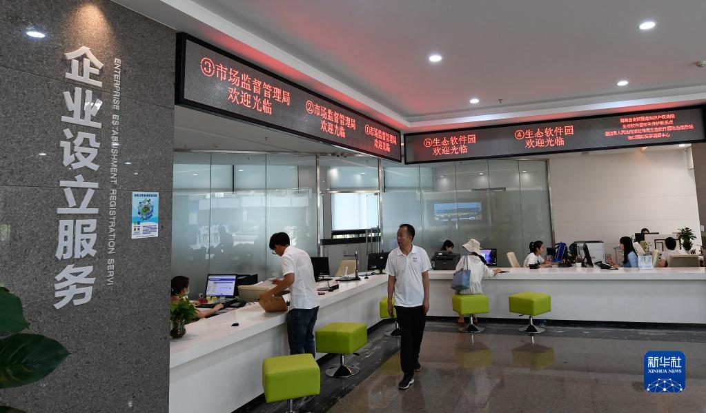 海南自由貿(mào)易港生態(tài)軟件園企業(yè)服務超市的工作人員為入園企業(yè)提供相關服務(5月31日攝)。新華社記者 楊冠宇 攝