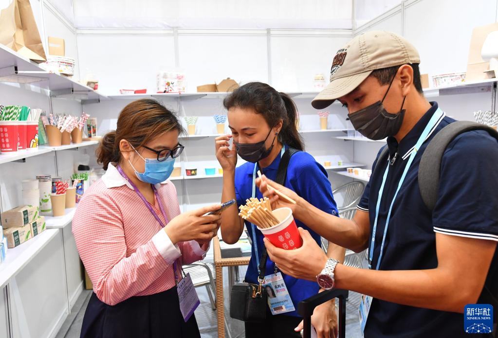 10月15日,在第130屆廣交會(huì)上,來(lái)自哈薩克斯坦的采購(gòu)商在和一家環(huán)保餐具參展商(左)洽談。新華社記者 劉大偉 攝