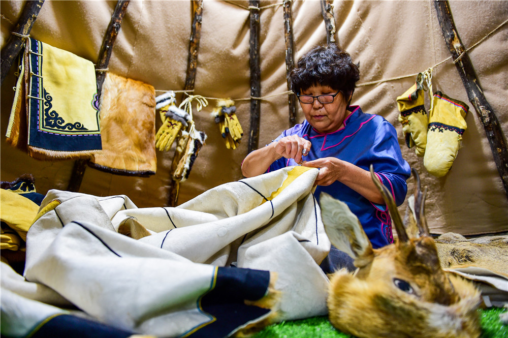 8月4日,在鄂倫春自治旗阿里河鎮(zhèn),吳玲芝在縫制一件獸皮衣,她是鄂倫春狍角帽制作技藝內(nèi)蒙古自治區(qū)級非遺傳承人。新華社記者 連振 攝