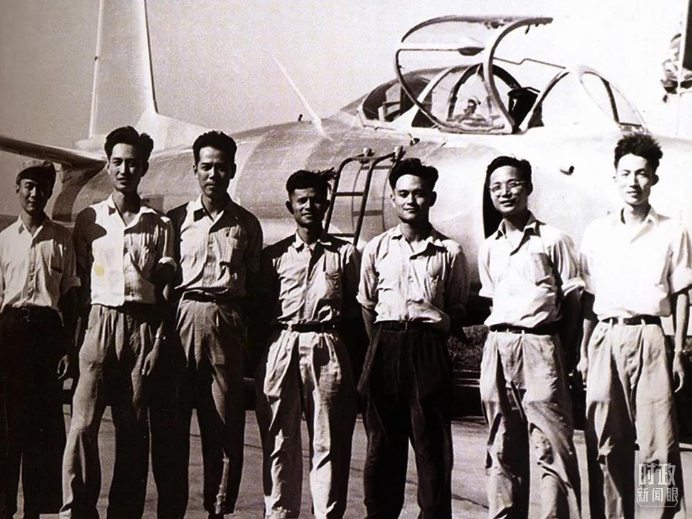 △1958年,顧誦芬(右二)與設(shè)計(jì)組成員在殲教-1飛機(jī)前合影。(資料圖)