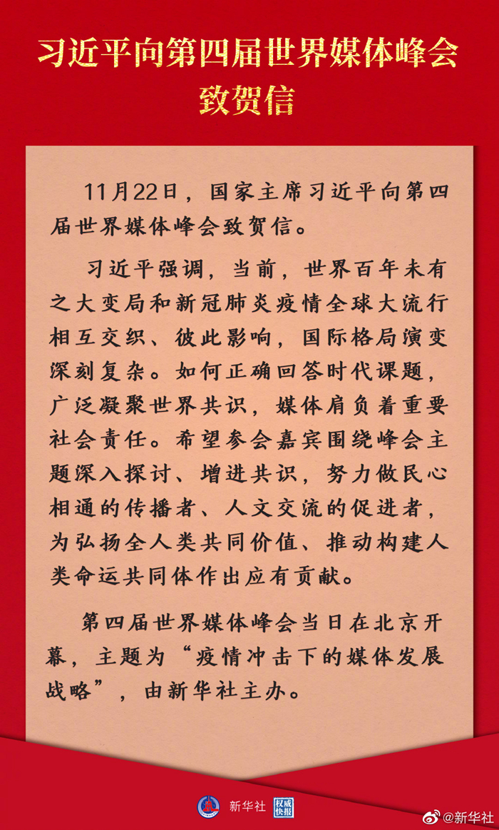 新華社北京11月22日電 11月22日,國家主席習(xí)近平向第四屆世界媒體峰會致賀信。