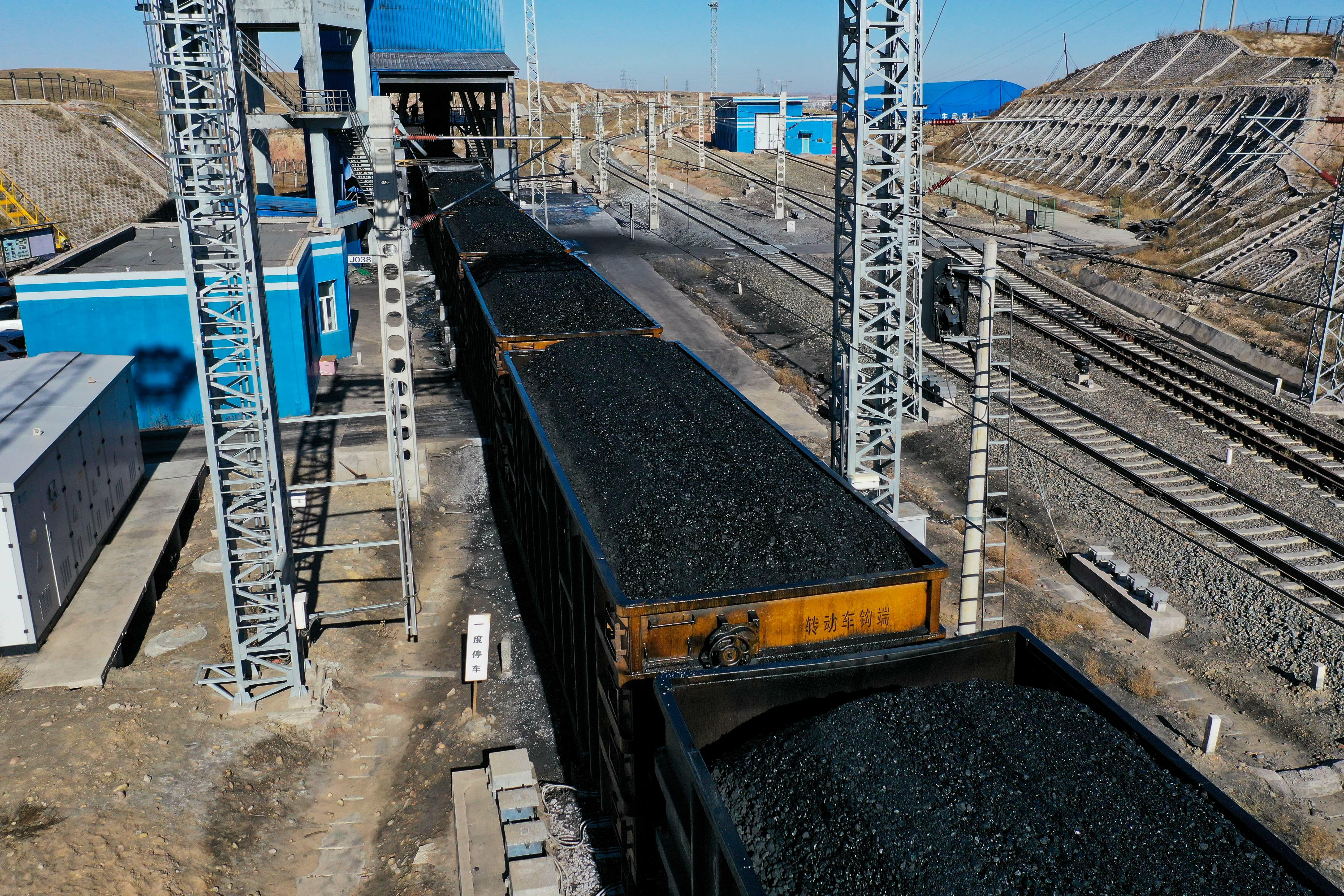 這是11月23日在位于內(nèi)蒙古鄂爾多斯市淮河能源西部煤電集團色連二礦罕臺川集裝站拍攝的正在裝煤的列車(無人機照片)。新華社記者 李志鵬 攝