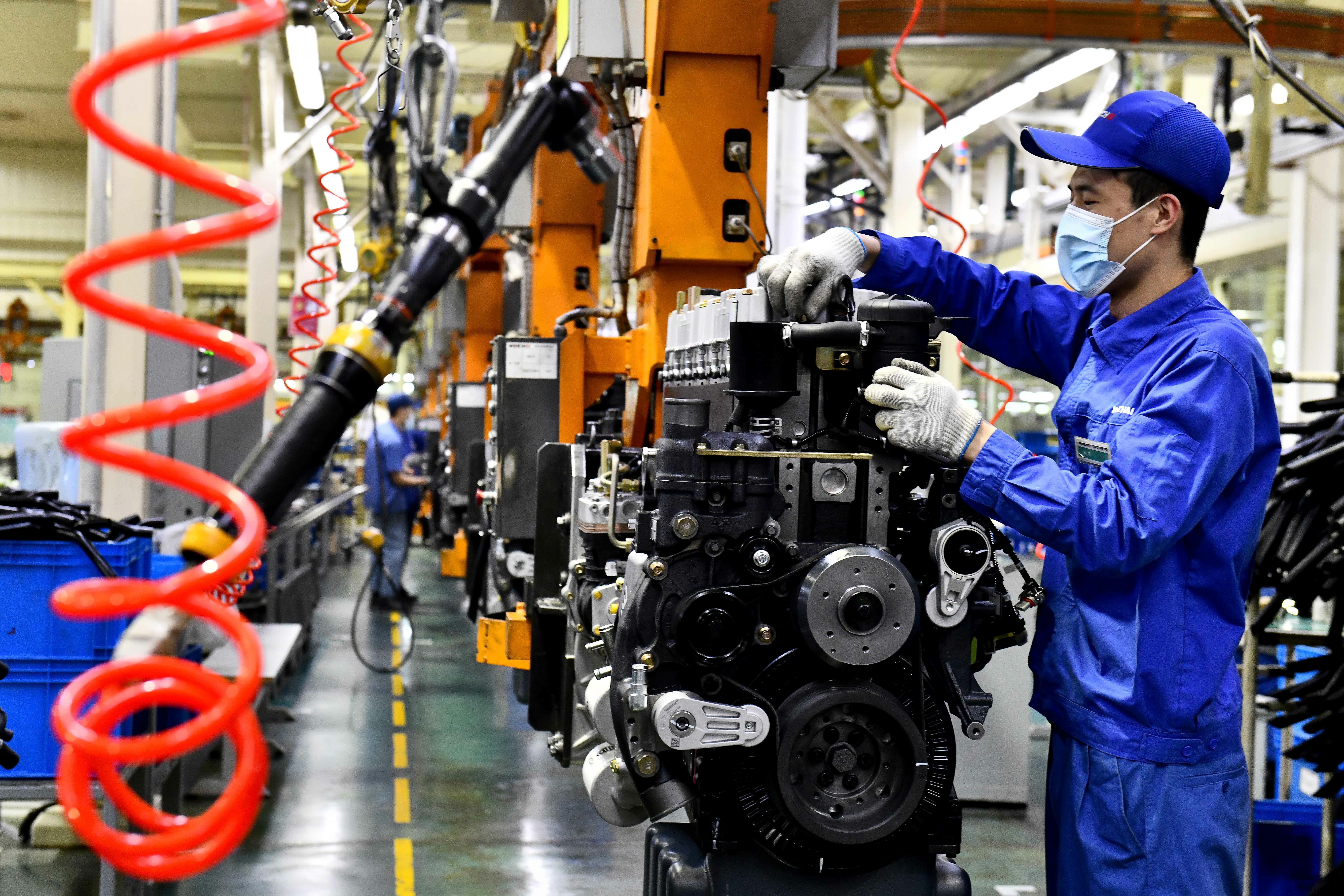 在位于山東濰坊的濰柴集團總裝車間,工人在流水線上裝配發(fā)動機(4月22日攝)。新華社記者 郭緒雷 攝