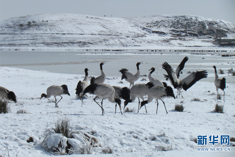 黑頸鶴在白雪中翩翩起舞(11月25日攝)。新華網發(fā)(鄭遠見 攝)