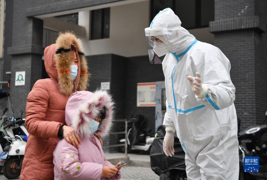 12月27日,在西安市雁塔區(qū)孟村小區(qū),盧晨陽(左二)引導(dǎo)居民進(jìn)行核酸檢測。新華社記者 張博文 攝