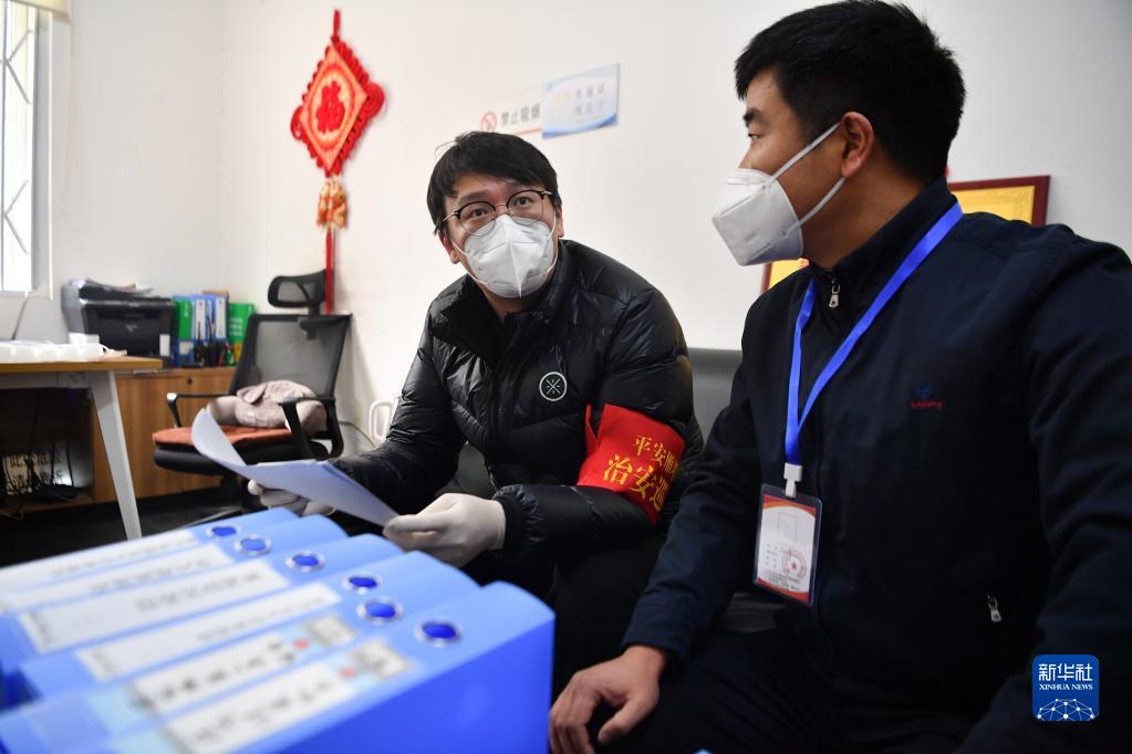 12月27日,在西安市雁塔區(qū)孟村小區(qū),盧晨陽(左)在查閱孟村小區(qū)疫情防控臺賬。新華社記者 張博文 攝