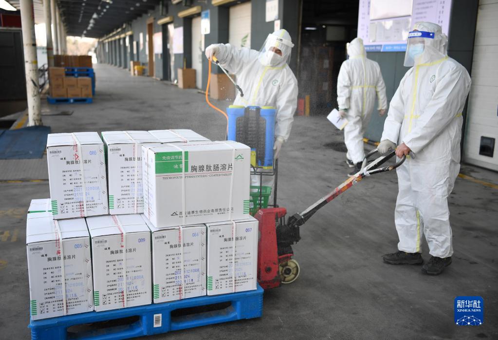 12月28日,陜藥集團(tuán)派昂醫(yī)藥公司工作人員對即將入庫的藥品進(jìn)行消殺。新華社記者 邵瑞 攝