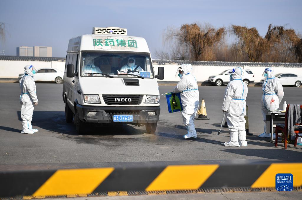 12月28日,陜藥集團(tuán)派昂醫(yī)藥公司工作人員對進(jìn)入園區(qū)的運輸車輛進(jìn)行消殺。新華社記者 邵瑞 攝
