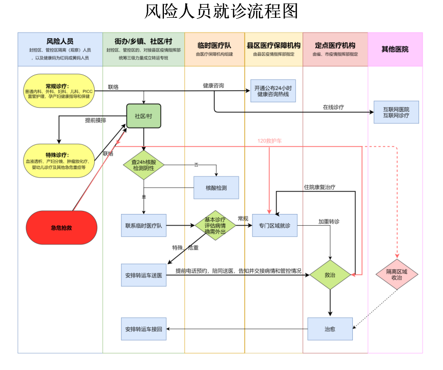 有急診搶救醫(yī)療需求的風(fēng)險(xiǎn)人員,直接撥打120急救電話,同時(shí)通知社區(qū)(村)工作人員對(duì)接120救護(hù)車、填寫人員交接單,由120救護(hù)車聯(lián)系風(fēng)險(xiǎn)人員醫(yī)療保障醫(yī)療機(jī)構(gòu)、定點(diǎn)醫(yī)療機(jī)構(gòu),或就近送至具備相應(yīng)診療能力的醫(yī)療機(jī)構(gòu)。診療結(jié)束后,醫(yī)療機(jī)構(gòu)聯(lián)系社區(qū)(村)由縣區(qū)轉(zhuǎn)運(yùn)專班“點(diǎn)對(duì)點(diǎn)”接回。