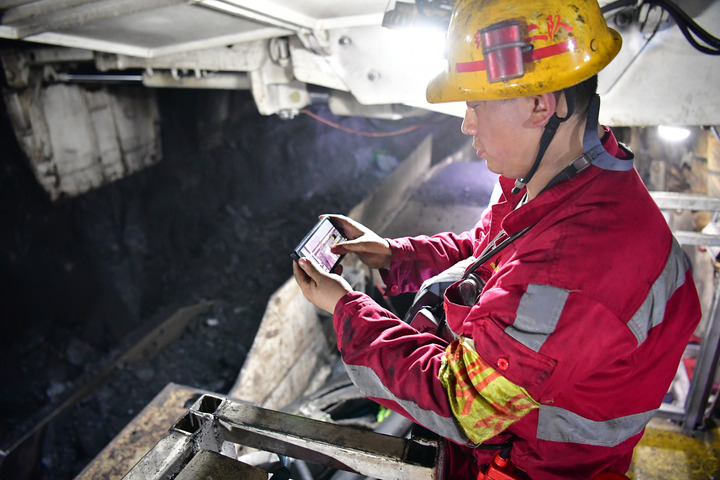 在曹家灘智慧礦山智能化工作面內,綜采二隊機電副隊長蔡進通過操作手機控制生產設備。新華社記者邵瑞 攝