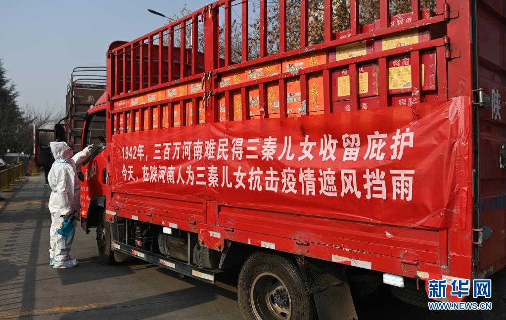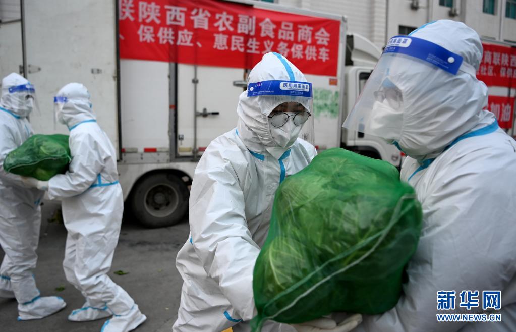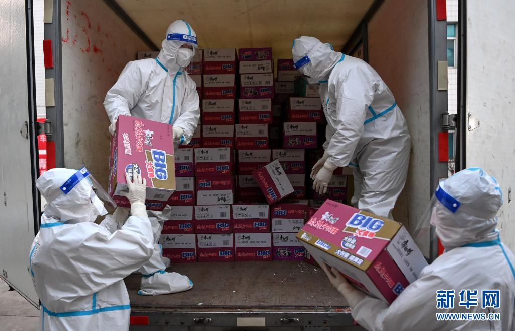1月2日,西安醫(yī)學(xué)院的學(xué)生志愿者在搬運(yùn)物資。當(dāng)日,陜西省農(nóng)副食品商會(huì)向西安醫(yī)學(xué)院捐贈(zèng)價(jià)值40余萬元的愛心蔬菜、食品物資、生活物資。