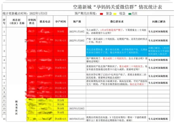 “人命關(guān)天,要趕緊把孕婦的底數(shù)摸清,她們住哪里、電話多少,同時也要想辦法把現(xiàn)有的醫(yī)生和孕婦‘連起來’,把專業(yè)的事情交給專業(yè)的人來解決。”據(jù)空港新城黨委組織部部長葛峰介紹,2021年12月31日早上,在了解到陽光里社區(qū)有孕婦需要去醫(yī)院進(jìn)行檢查和分娩的需求后,當(dāng)天下午4點多,社區(qū)黨支部書記殷振建就迅速將22名孕婦的相關(guān)情況及時上報給組織部,并由專人對群里孕媽媽們的訴求進(jìn)行實時統(tǒng)計。