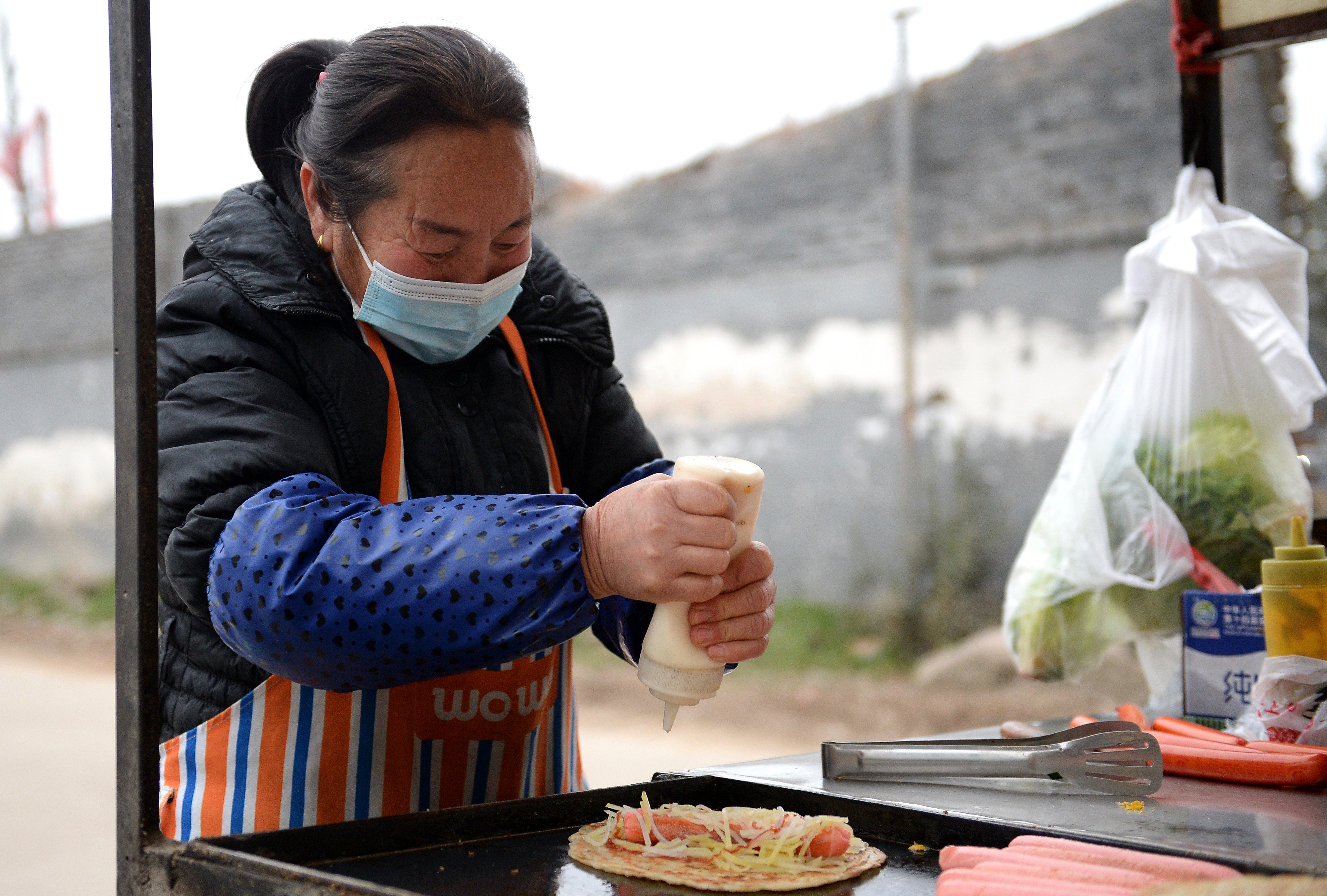 “多一點(diǎn)沙拉醬!”“好嘞!”攤餅、切烤腸、加土豆絲、摘青菜、擠沙拉醬……趙軍曉動(dòng)作嫻熟,不到三分鐘,就把一份新鮮的手抓餅遞給了攤前的顧客。作為西唐寨村的村民,這是西安多日封閉式管理以來(lái),她第一天外出擺攤。“有點(diǎn)興奮,通知五點(diǎn)可以出來(lái),我四點(diǎn)就把東西準(zhǔn)備好了!”雖然戴著口罩,她仍是笑意難掩。