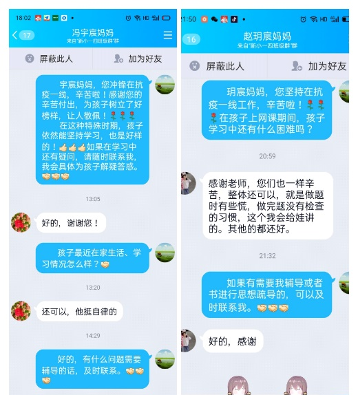 面對家長在抗“疫”一線經(jīng)受的各種考驗(yàn),孩子們時刻惦記,情緒起伏較大。班主任和任課老師密切溝通,溫暖陪伴,守護(hù)抗“疫”一線工作人員子女的心理健康。通過微信視頻連線、電話等方式與孩子們密切溝通,用質(zhì)樸的話語與孩子們談心,帶去學(xué)校的關(guān)心和溫暖,緩解他們不安的情緒。
