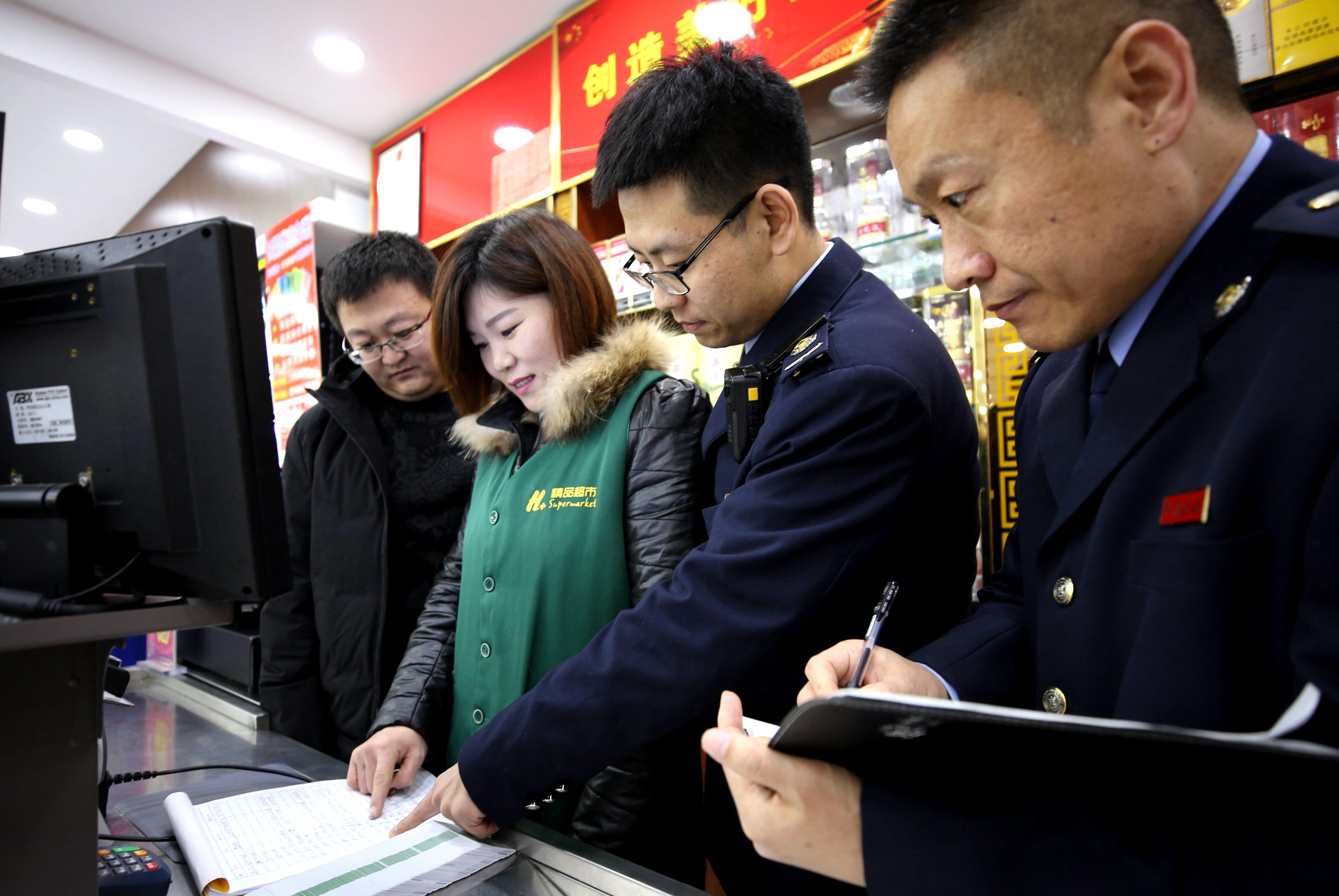 河北大廠回族自治縣紀(jì)檢干部和稅務(wù)部門稽查人員在一家超市檢查是否有單位公款購(gòu)買購(gòu)物卡情況(2019年1月22日攝)。新華社記者 王曉 攝