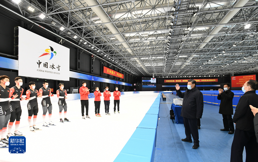 2022年1月4日,中共中央總書(shū)記、國(guó)家主席、中央軍委主席習(xí)近平在北京考察2022年冬奧會(huì)、冬殘奧會(huì)籌辦備賽工作。這是4日下午,習(xí)近平在二七廠冰雪項(xiàng)目訓(xùn)練基地速滑館,向參訓(xùn)運(yùn)動(dòng)員、教練員表示慰問(wèn)。新華社記者 謝環(huán)馳 攝