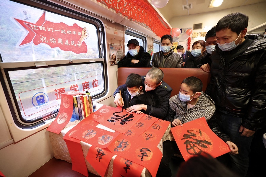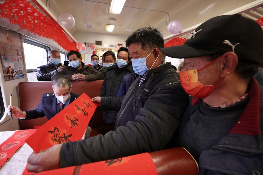 列車工作人員為旅客寫春聯(lián)(央廣網(wǎng)發(fā) 劉松霖?cái)z)