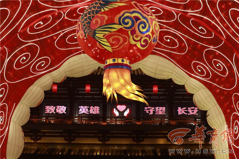 在雁南一路口設(shè)置了“致敬英雄 守望長安”燈組。宋立嬌介紹,設(shè)計這組燈是為了向抗疫英雄致敬,并鼓舞全市人民抗疫士氣。雁南一路以南水池上“百鳥朝鳳”燈組,以鳳凰、牡丹、百鳥為主題,打造百鳥朝鳳氛圍裝置,體現(xiàn)出一切生機勃勃,美好時光來臨,看到了一片美好的前景。