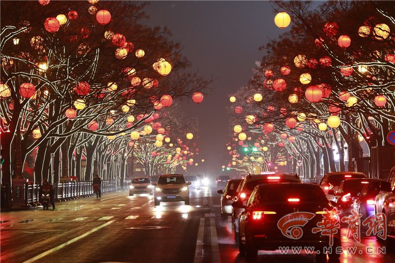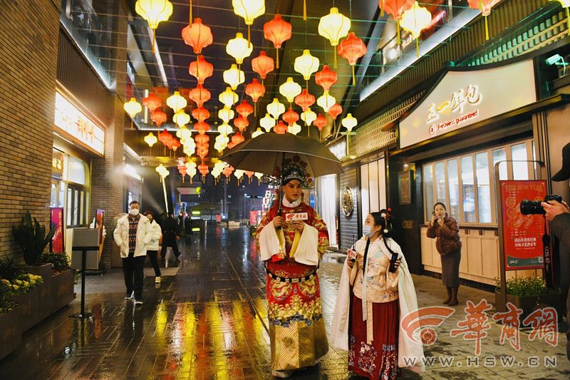 在易俗社文化街區(qū),天街燈市造型燈籠和大型石榴燈籠遠觀燦若星河,近賞光影絢爛;“花落易俗”投影3D燈光秀也非常驚艷;戲曲雙水滴紅藍樹燈、“福氣高升”“雙神迎喜”、生旦凈丑、戲曲花冠燈等燈組及藝術(shù)裝置展現(xiàn)傳統(tǒng)文化魅力。