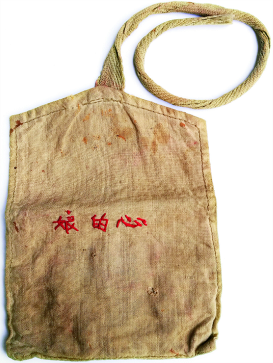 媽媽記掛遠在陜北農(nóng)村吃苦的兒子,親手縫制了一個針線包,上面繡了三個紅色的字:娘的心。
