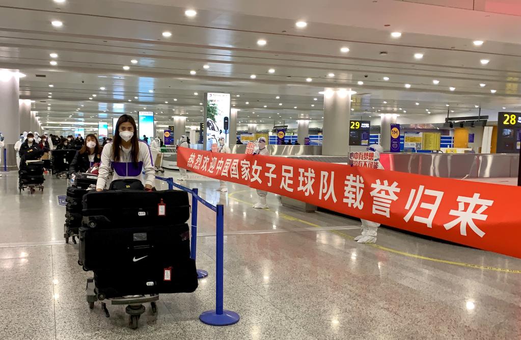 2月7日,中國女足隊(duì)員抵達(dá)上海浦東國際機(jī)場。新華社發(fā)(中國東方航空供圖)