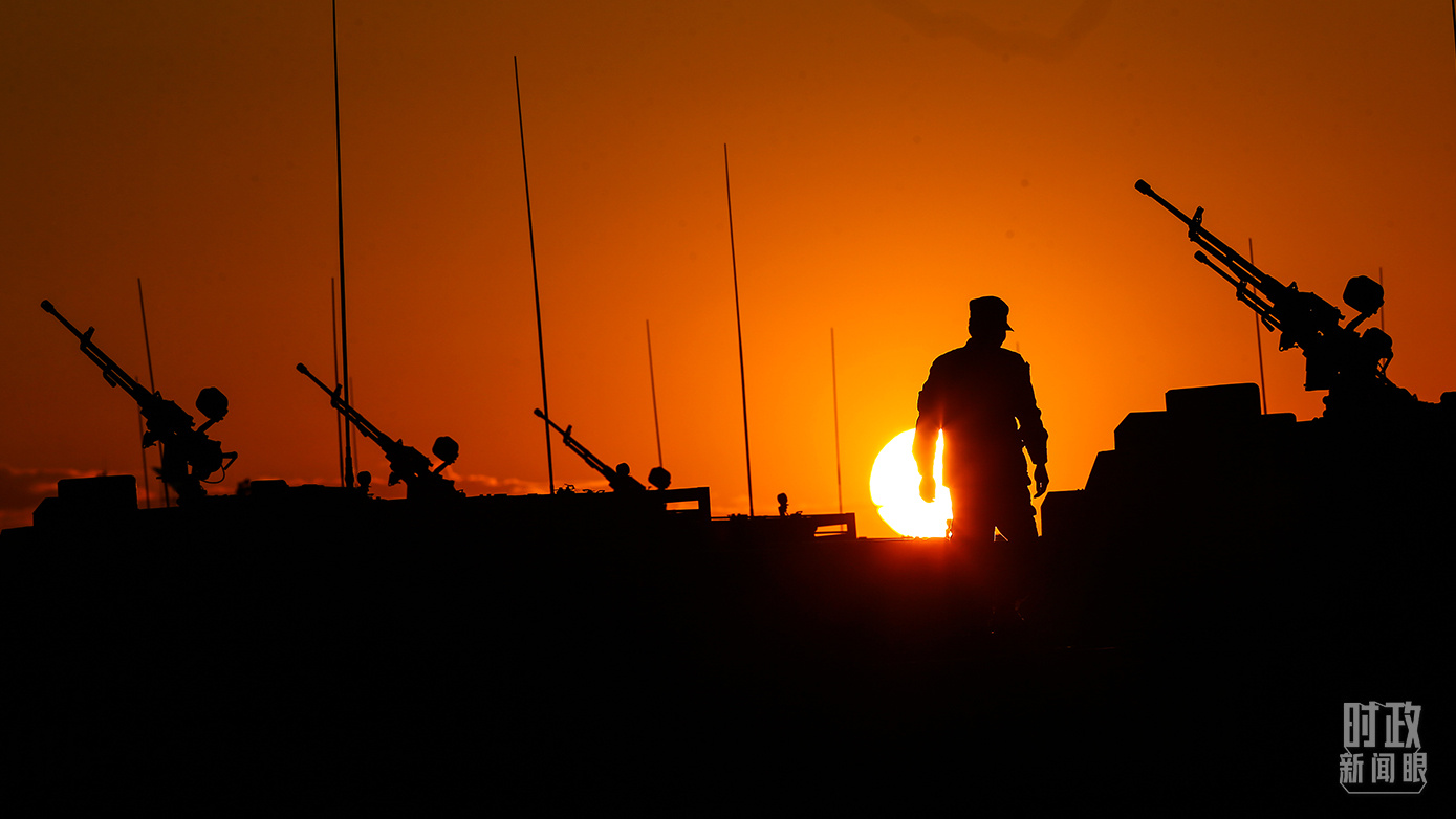 △2017年7月,士兵在晨曦中登上裝甲戰(zhàn)車(chē),為慶祝中國(guó)人民解放軍建軍90周年朱日和大閱兵做最后的準(zhǔn)備。(總臺(tái)國(guó)廣記者李晉拍攝)
