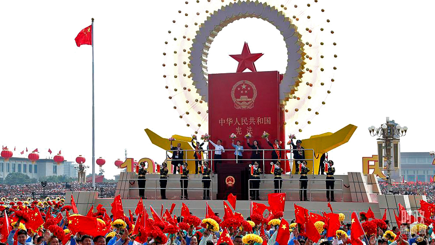 △2019年10月1日,慶祝中華人民共和國(guó)成立70周年大會(huì)現(xiàn)場(chǎng),這是群眾游行中的“民主法治”方陣。(圖/視覺(jué)中國(guó))