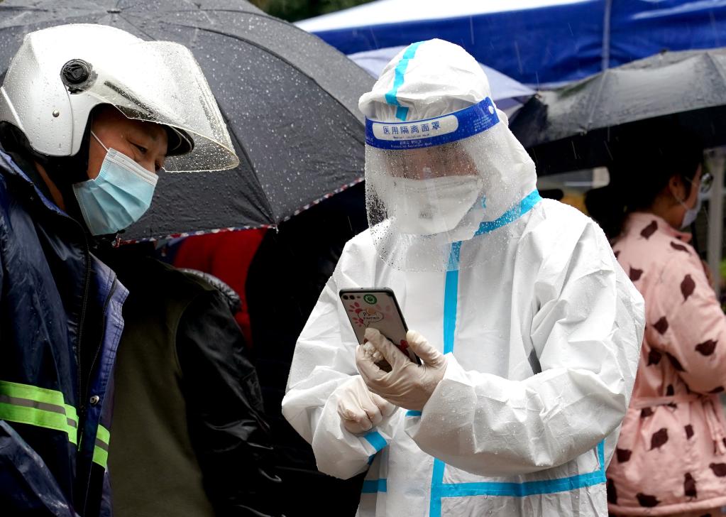 3月13日,志愿者在深圳羅湖區(qū)東門廣場核酸檢測點(diǎn)引導(dǎo)居民。新華社發(fā)(儲焱攝)