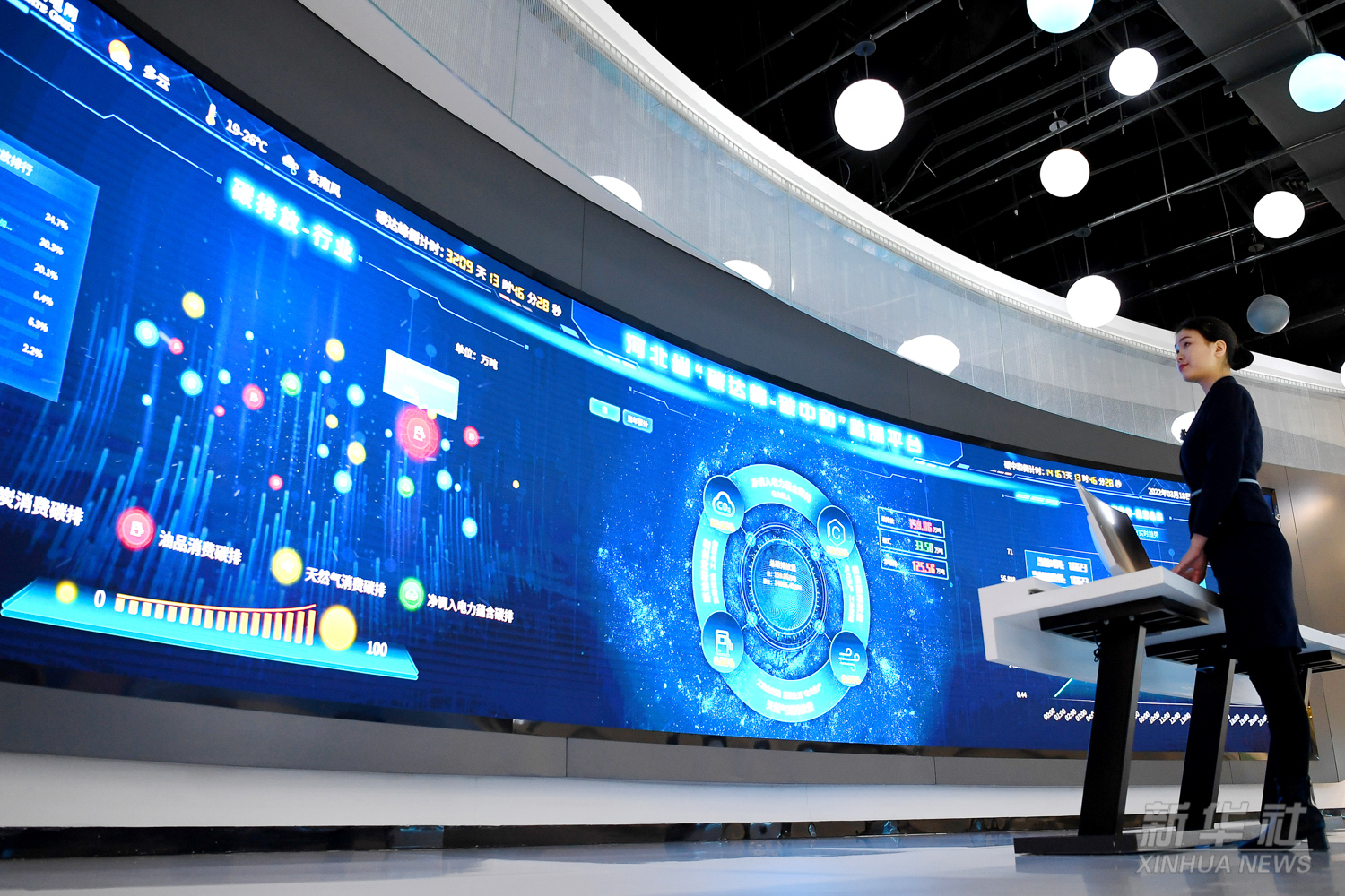 位于雄安新區(qū)首座新建220千伏變電站——劇村站內(nèi)的“碳達(dá)峰、碳中和”監(jiān)測(cè)平臺(tái),通過(guò)電力大數(shù)據(jù)折算碳排放量,對(duì)雄安新區(qū)碳排放、碳減排、碳匯進(jìn)行實(shí)時(shí)監(jiān)測(cè)分析(2022年3月18日攝)。