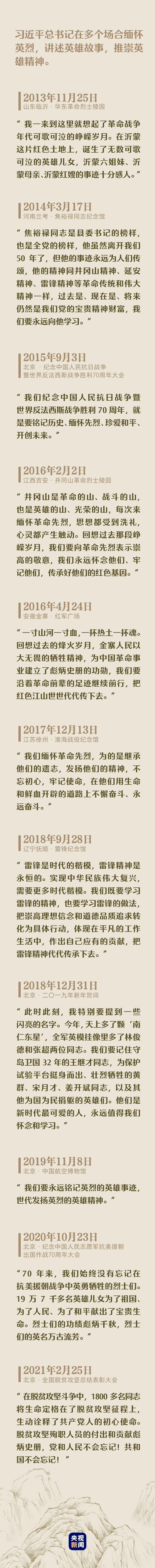“中華民族是崇尚英雄、成就英雄、英雄輩出的民族,和平年代同樣需要英雄情懷。”黨的十八大以來,習(xí)近平總書記在多個場合緬懷英烈,講述英雄故事,推崇英雄精神,激勵在全社會樹立崇尚英雄、緬懷先烈的良好風(fēng)尚。