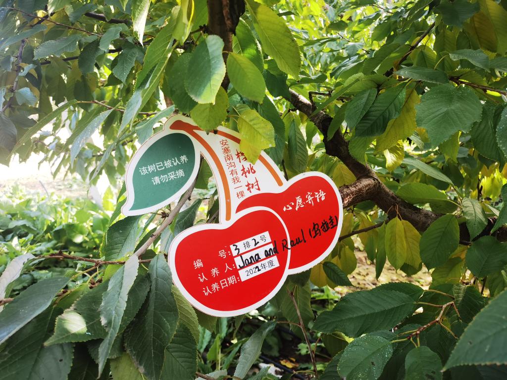 延安市安塞區(qū)高橋鎮(zhèn)南溝村的櫻桃園里,被國外消費(fèi)者認(rèn)養(yǎng)的櫻桃樹。受訪者供圖