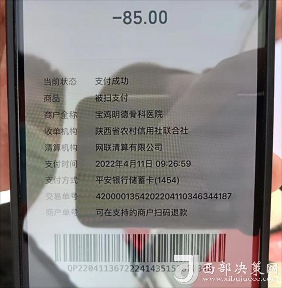 做核酸的市民提供的繳費(fèi)截圖發(fā)現(xiàn),他們兩個(gè)人做完核酸繳費(fèi)85元,分別要做咽拭子和鼻拭子兩個(gè)項(xiàng)目,收款商戶單位全稱為:寶雞明德骨科醫(yī)院。