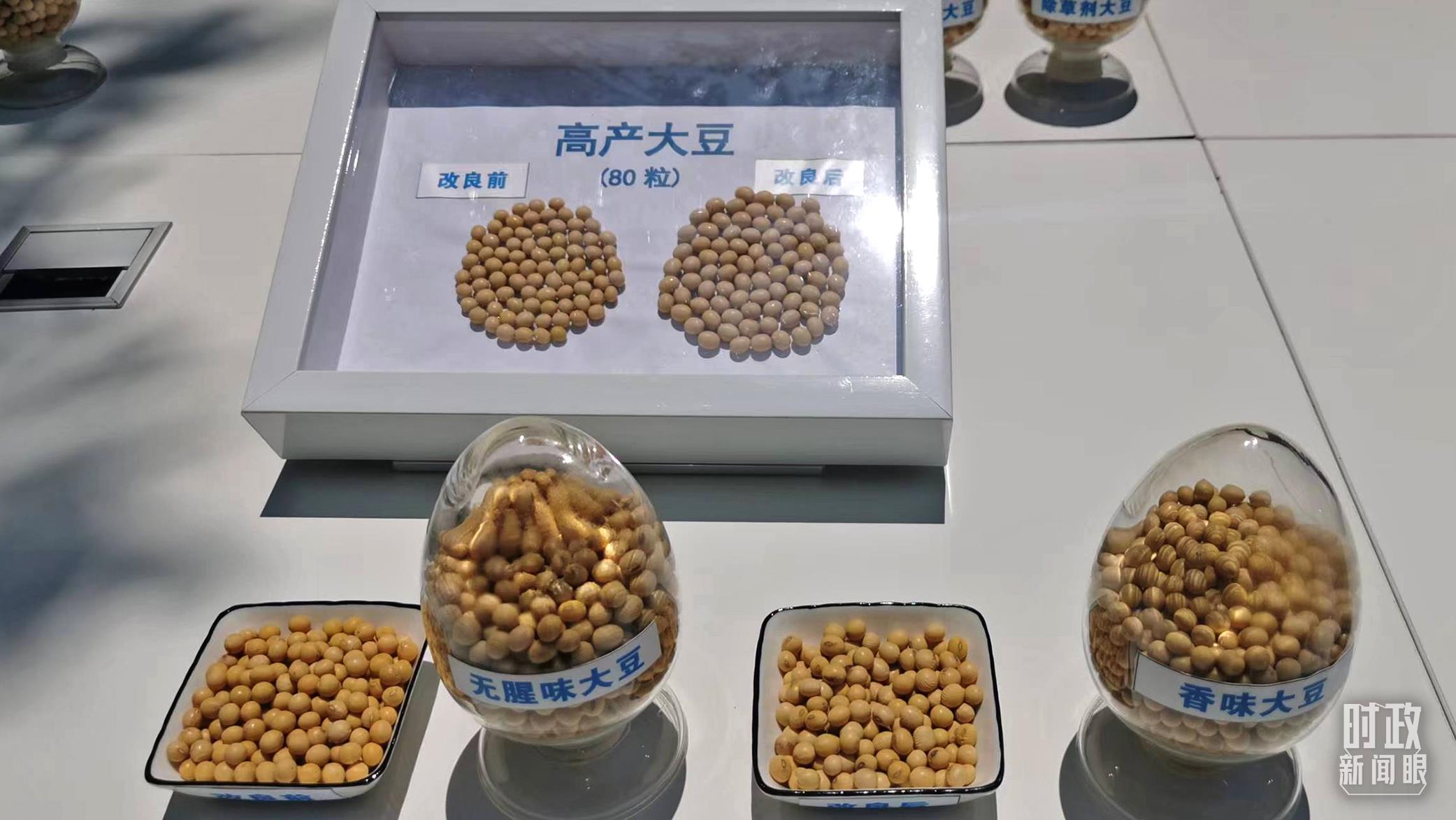 △種子實(shí)驗(yàn)室展示改良前后的大豆樣品。(總臺(tái)央視記者鐘銳拍攝)