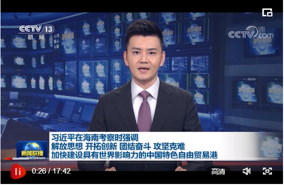 4月10日至13日,習近平在海南省委書記沈曉明、省長馮飛陪同下,先后來到三亞、五指山、儋州等地,深入科研單位、國家公園、黎族村寨、港口碼頭等進行調研。
