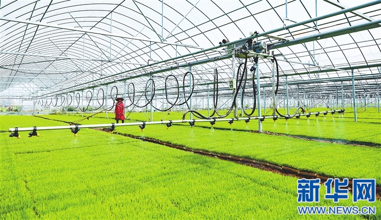 在江西省新余市渝水區(qū)新宋村的育秧大棚內(nèi),一臺自動化噴灌機沿著軌道勻速給秧苗灌溉。新華網(wǎng)發(fā) 張翰林 攝