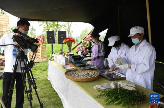 5月15日,肥西縣柿樹崗鄉(xiāng)村民通過“云上”直播制作當(dāng)?shù)孛朗齿镒郁昔巍P氯A社記者劉軍喜攝