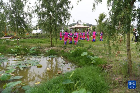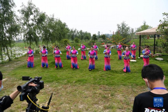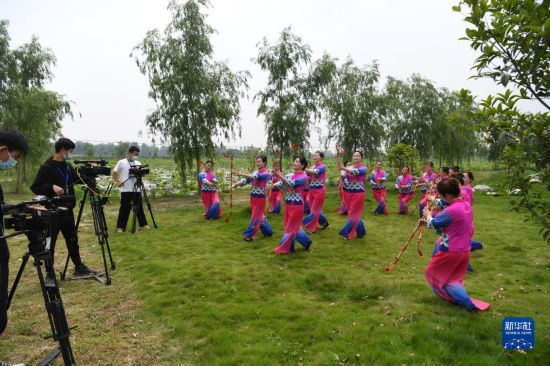 5月15日,肥西縣柿樹崗鄉(xiāng)村民通過“云上”直播表演當(dāng)?shù)貍鹘y(tǒng)非遺文化項目蓮湘舞。新華社記者劉軍喜攝