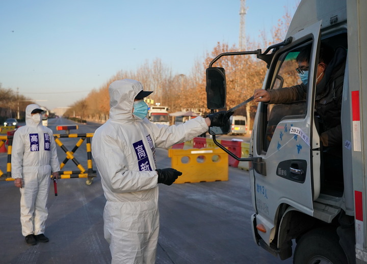 石家莊市公安局高新技術(shù)產(chǎn)業(yè)開發(fā)區(qū)公安分局民警在藁城區(qū)通往市區(qū)的路口執(zhí)勤(2021年1月10日攝)。當(dāng)日是首個(gè)“中國(guó)人民警察節(jié)”。新華社記者 楊世堯 攝