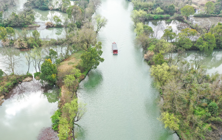 游船行駛在西溪濕地水道上(2021年3月2日攝,無人機照片)。新華社記者 翁忻旸 攝