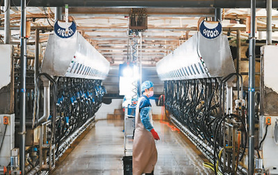 近年來,內(nèi)蒙古自治區(qū)巴彥淖爾市臨河區(qū)干召廟鎮(zhèn)依托當(dāng)?shù)貎?yōu)勢大力發(fā)展養(yǎng)牛產(chǎn)業(yè),采取“支部+合作社+基地+農(nóng)戶”的發(fā)展模式,帶動(dòng)農(nóng)戶發(fā)展養(yǎng)牛產(chǎn)業(yè),促進(jìn)農(nóng)戶增收致富,助力鄉(xiāng)村振興。圖為1月19日,巴彥淖爾市臨河區(qū)東鑫奶牛養(yǎng)殖專業(yè)合作社擠奶車間。貝 赫攝(新華社發(fā))